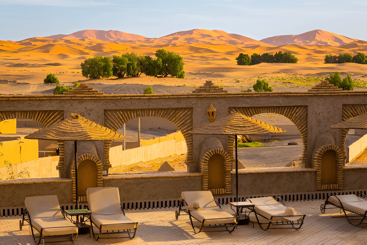 In Merzouga, you will experience the magic of the Sahara with a camel trek across the golden dunes, a dramatic desert sunset, sandboarding, and a night under the stars in a Luxury desert camp with music and fire. The journey concludes as we travel through the Ziz Valley, Midelt, Cedar Forest, Azrou, and Ifrane—often called the “Switzerland of Morocco”—before reaching Fes, the spiritual and cultural capital of the country.